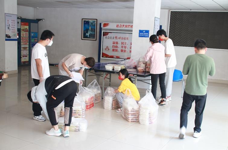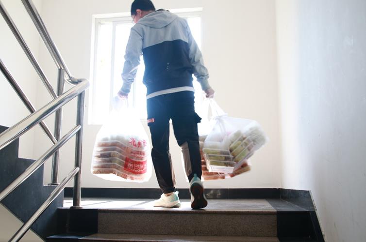后勤保障組主要負責全體人員的餐飲無接觸配送、采購物資的分發(fā)等。每日訂餐結束后,志愿者從后臺導出訂餐人員信息,整理出每樓層的總訂餐數、房間號及份數清單,為餐食的分發(fā)提前做好準備。志愿者取餐后按清單快速分揀各樓層所需餐食,各樓層餐食分配完成后,統(tǒng)一通知開門取餐,極大的減少了員工之間的接觸,大幅提高了配餐的效率,確保員工可以吃上熱乎的午餐和晚餐。目前每日送餐量接近400份,單樓層最大配送量超過80份,經過配送流程優(yōu)化后,每層在5-8min即可完成無接觸送餐,效率大大提高。