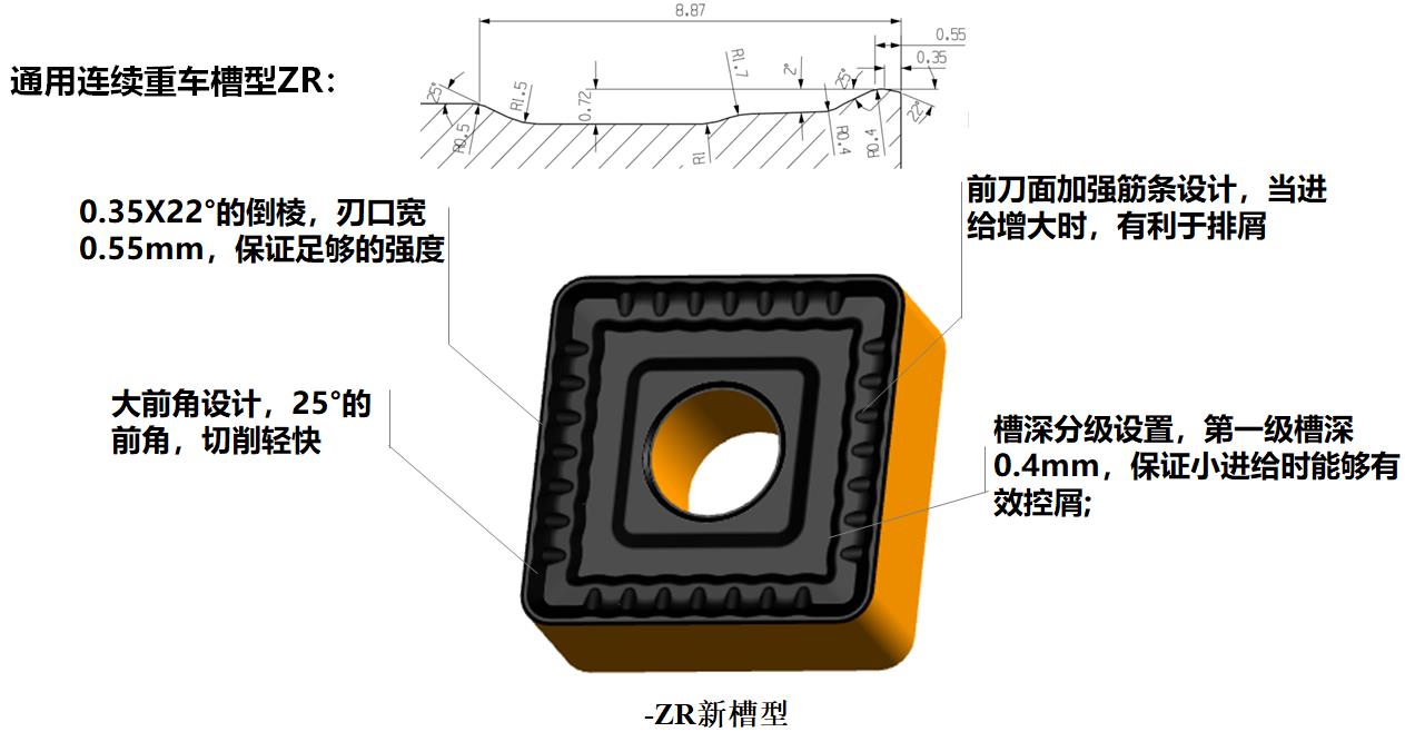 嶄新一代的CVD涂層刀片牌號,采用了雙氧梯度過渡層技術(shù)、晶核預(yù)植涂層技術(shù)和基體微結(jié)構(gòu)精確控制技術(shù),卓著提升刀片刃線強度、抗磨損和高溫抗氧化綜合性能,雙色標(biāo)識層和超滑Al2O3涂層前刀面,與重力車削專用槽型匹配,全面提升重力車削刀片性能。