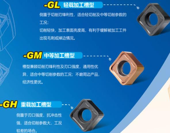 應(yīng)用范圍:豐富的刀片槽型選擇,可滿足不同工況下 P、M、K、S的高效銑削加工。