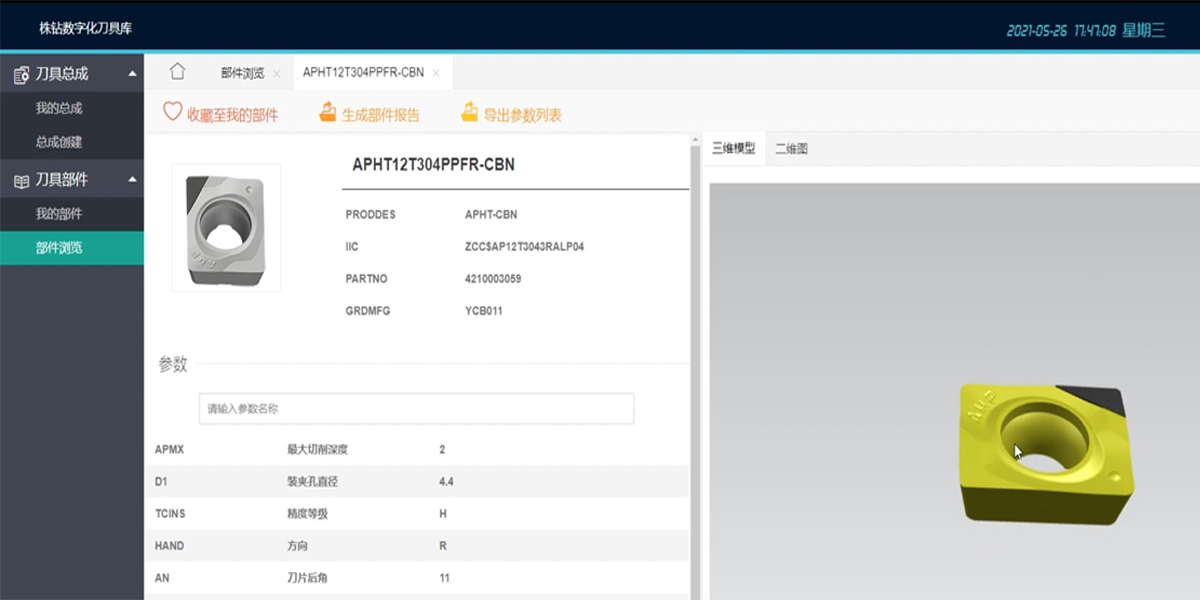 1. Users can assemble tools online by exporting3D models, engineering drawings and STEP files of the parts of the tools to builda personalized virtual tool library and realize optimized cutting tool solutionsat lower cost.
