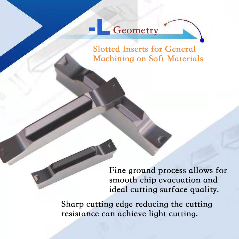 Ultra-ground insert with positive cutting angle, sharp edge and oblique geometry allow for low resistance, stable control of the chip flow and better surface quality.